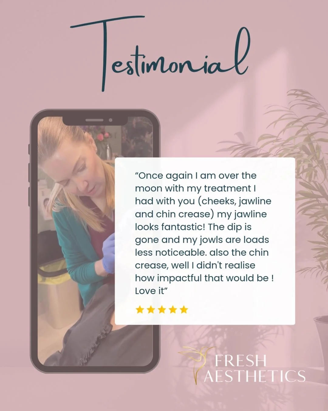 "Jayne I just want to say thank you so much for today! I really was so nervous of getting the filler but didn’t even feel a thing, and over the moon with the results I can’t stop looking at myself as I don’t look tired anymore, honestly your work is amazing, thank so much again." — Rebecca xx